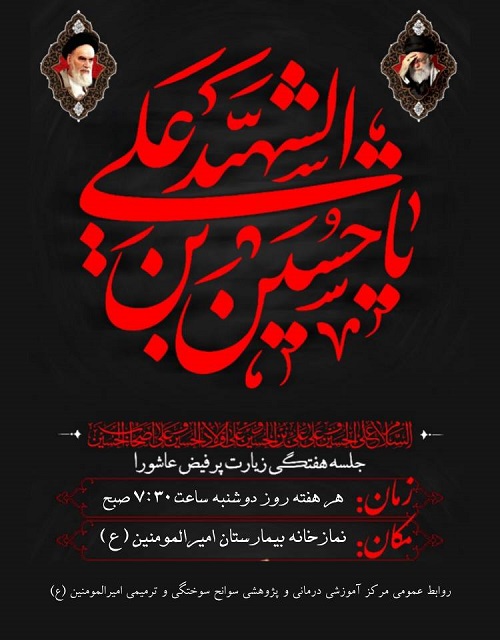 به اطلاع همکاران محترم می‌رساند که برنامه معنوی و پرفیض قرائت زیارت عاشورا هر هفته روز دوشنبه ساعت ۷:۳۰ صبح در نمازخانه مرکز آموزشی، درمانی و پژوهشی سوانح سوختگی و ترمیمی امیرالمؤمنین (ع) برگزار می‌گردد.
