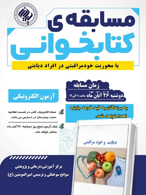 به اطلاع همکاران گرامی می رساند، به مناسبت هفته کتابخوانی، خودمراقبتی و دیابت، مسابقه کتابخوانی با محوریت خودمراقبتی در افراد دیابتی، ویژه کارکنان مرکز آموزشی درمانی و پژوهشی سوانح سوختگی و ترمیمی امیرالمومنین (ع) برگزار میشود.